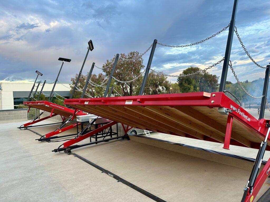 FireVent’s Portable Units (US Patent #11,844974) are designed for easy setup and take down and can be easily moved from location to location. These units can go from a flat position to a 12/12 pitch. There are currently two standard sizes available; 8ft x 12ft and 10ft x 16ft. These Portable Units can be easily mounted on top of a shipping container with the use of the FireVent Mounting Tracks. FireVent also makes a hydraulic version of the 10ft x 16ft Portable Unit. Structurally engineered load ratings for each unit. Please see the gallery below for pictures.